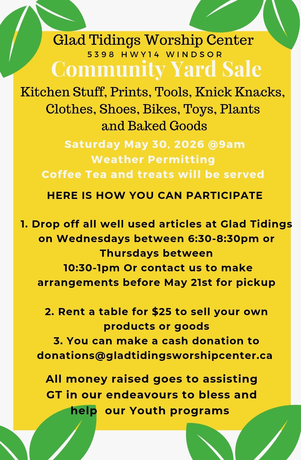 Please contact info@gladtidingsworshipcenter.ca with any questions regarding donation drop off or table rentals for your products…